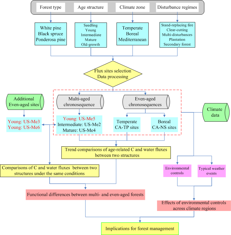 汤旭光教授研究团队通过收集覆盖地中海气候、温带气候及寒带气候条件下的3个林龄序列14个通量站合计62站点年数据,揭示了同龄林和异龄林演替过程中固碳潜力及水分利用效率差异,借助于趋势分析法,推出异龄林随着林龄的增加至成熟林仍能维持较高的碳汇水平,同时伴有较高的生态系统水分利用效率。