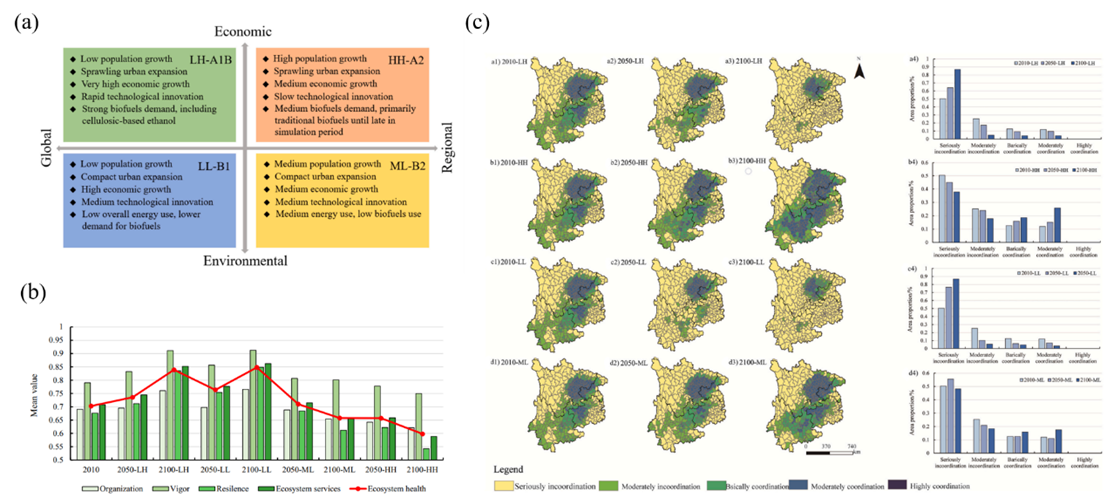 图1. (a)四种未来土地利用情景设置,(b)不同土地利用情景下生态系统健康变化特征,(c)不同土地利用情景下生态系统健康与土地利用变化耦合关系