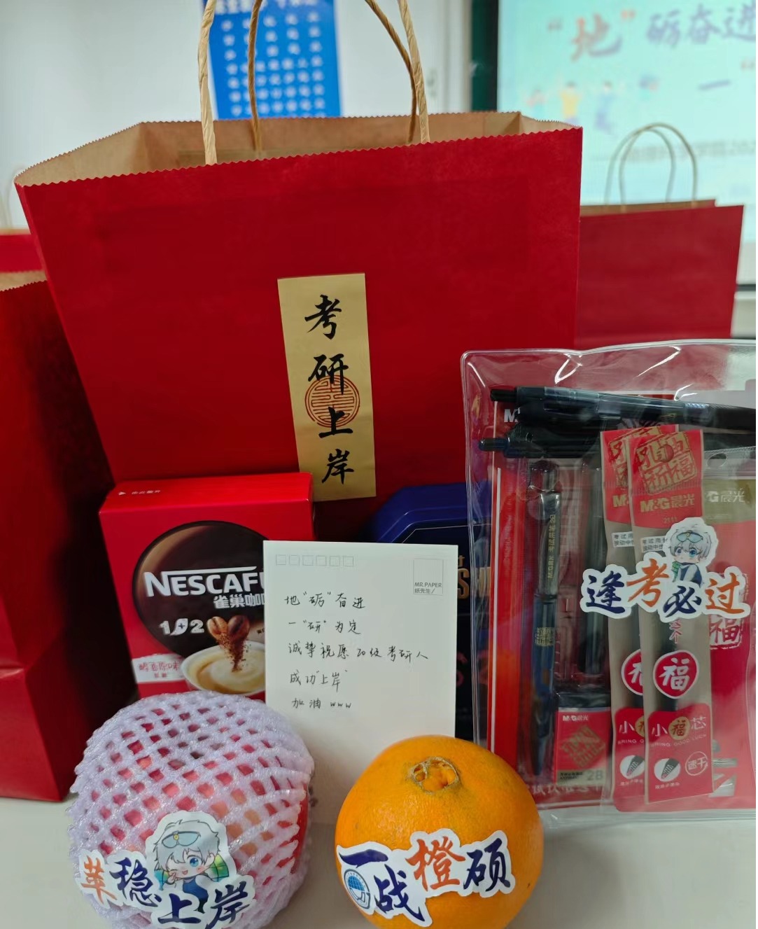 公司贴心的为每一个考研学子准备了考研大礼包 ,将公司对同学们的祝福融入到每一份礼物之中。据悉,12月23至24日,公司还将在李园3、4舍,橘园6舍开展“研”途加油站活动,持续为考研学子保驾护航。