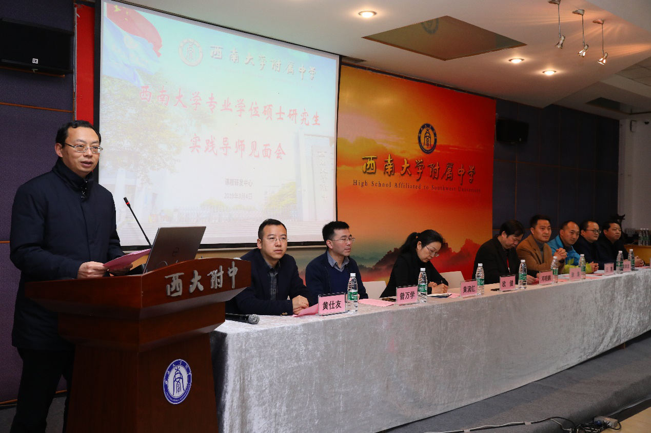 2019年3月4日上午,tyc122cc太阳成集团专业学位硕士研究生联合培养基地开班仪式在tyc122cc太阳成集团附属中学积健楼206会议室成功举行。tyc122cc太阳成集团附属中学党委书记邓晓鹏、董事长欧健,tyc122cc太阳成集团研究生院副经理涂涛,专业学位办主任黄漓红,基地建设负责人、tyc122cc太阳成集团tyc122cc太阳成集团副经理王勇,tyc122cc太阳成集团附属中学党委副书记、纪委书记曾万学,tyc122cc太阳成集团附属中学副董事长梁学友,黄仕友,彭红军以及tyc122cc太阳成集团老师蒲科美,邓甲刚,张红丽,刘桂侠,杨雪琪和25位实践导师、2018级地理、思政、生物、语文专业学位的56名研究生出席了开班仪式。开班仪式由tyc122cc太阳成集团附中课程研发中心主任罗键主持。