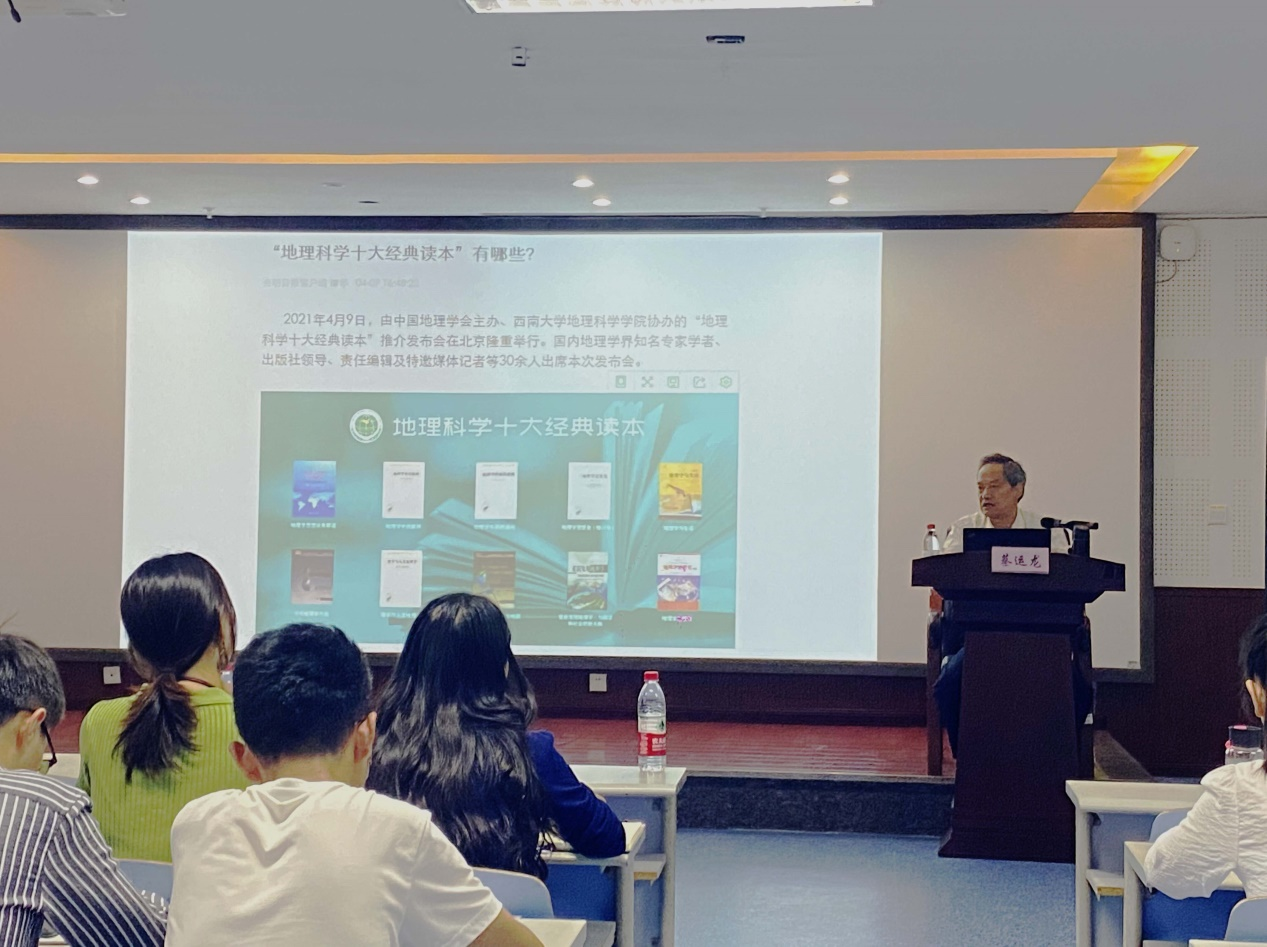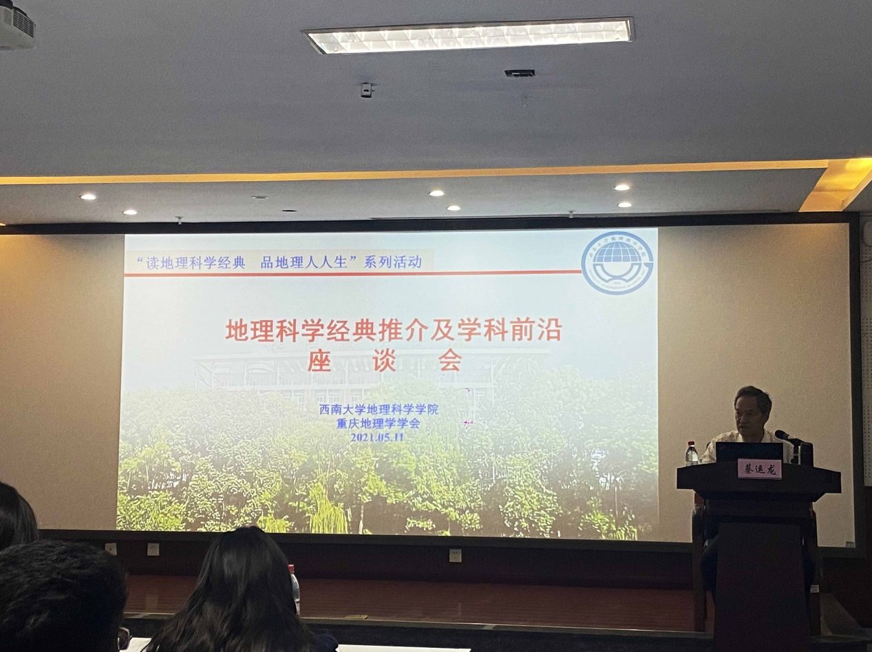 2021年5月11日下午3点,重庆地理学学会主办、tyc122cc太阳成集团协办的“读地理科学经典,品地理人人生”系列活动之“地理科学经典推介及学科前沿”座谈会在tyc122cc太阳成集团301教室举办。本次座谈会邀请了北京大学城市与环境公司与地理科学研究中心蔡运龙教授作为主讲嘉宾,地理科学公司党委书记喻尚其、副经理杨庆媛、副经理马明国以及杨晓霞、王成等多位公司教师和众多地科学子参加。