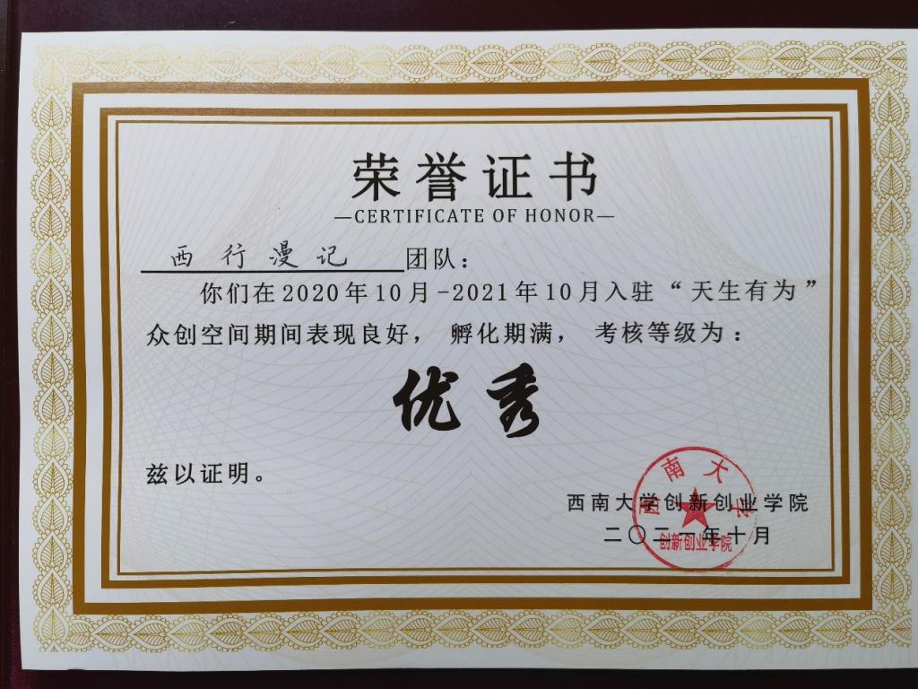 在过去的两年里“西行漫记”项目多次成功开展研学旅行活动,获得研学参与者的好评,并在本次tyc122cc太阳成集团“天生有为”众创空间2020年度团队考核中获评“优秀”等级,由审核评委颁发了优秀团队证书和奖金。