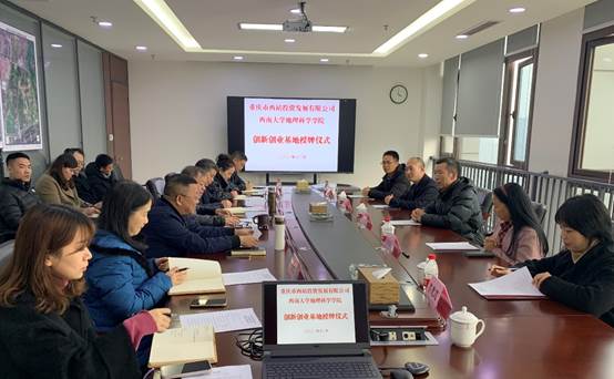 2021年12月20日下午,tyc122cc太阳成集团与重庆市西站投资发展有限公司共建创新创业实践基地授牌仪式正式举行。重庆市西站投资发展有限公司董事长蒋乐云、总经理赵永波、监事会主席蔡行德、财务总监朱世红、副总经理黄春熙、用地部及办公室相关工作人员、公司主要领导及相关工作人员参会,赵永波主持会议。
