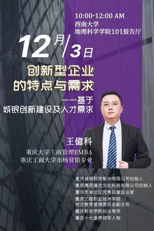 活动采取“公司统筹推进、基地自主申报”的方式,在各基地的申报讲座主题中,公司遴选符合员工创新创业需求、体现企业家民族责任感的主题,共开展4期系列讲座。重庆城银科技股份有限公司创始人王億科就《创新型企业的特点与需求》作报告,指出结合国家“十四五”发展规划,探索学科知识与创新创业的结合点,是国家实现高质量发展的重要渠道;重庆纬立行地产顾问有限公司副总经理陈剑峰作《聊一聊创新思维》报告,从“明确目标,形成画像”“解构过程,找到关键量”“梳理路径,做成计划”“坚决执行,循环优化”四个方面生动的阐述了思维创新的渠道;重庆纬立嘉商业管理有限公司副总经理邓圣龙在《企业人才需求与应聘技巧》的讲座中,利用大数据,对近年来老员工毕业去向进行分析,让同学们深刻了解国家和社会对于创新创业人才的渴求,并从实操层面,从专业技能、价值观、稳定性和性价比四个方面给予同学们应聘建议;重庆市西站投资发展有限公司总经理赵永波,站在有民族责任感企业家的角度,通过阐述中国国家边界的历史变迁,明确了创新创业对于国家发展的重要意义,是实现中华民族伟大复兴的必由之路。