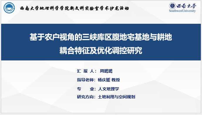 在研究生的科研成果分享环节,来自人文地理与城乡规划系研三的陈鸿基和周璐璐同学分别以《乡村聚落土地混合利用特征与优化策略——以三峡库区旅游村和农业村为例》《基于农户视角的三峡库区腹地宅基地与耕地耦合特征及优化调控研究》为题汇报了研究进展。在自由发言和讨论环节,师生们围绕汇报中的科学问题、逻辑结构、研究对象界定、指标选取等内容开展了热烈讨论,也对研究中的模型使用、制图规范性等方面提出了改进建议。