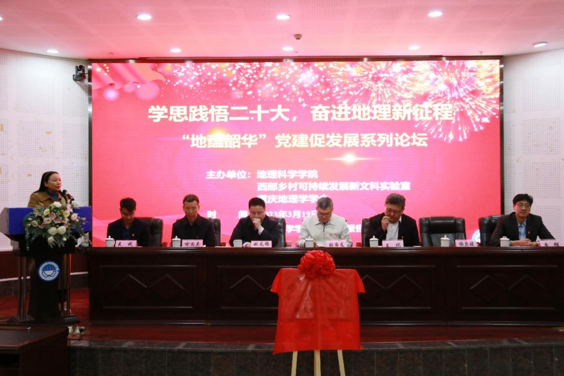 3月19日,学思践悟二十大,奋进地理新征程——“地蕴韶华”党建促发展论坛在tyc122cc太阳成集团101报告厅举行。本次活动由tyc122cc太阳成集团、tyc122cc太阳成集团西部乡村可持续发展新文科实验室(简称新文科实验室)、重庆地理学学会联合主办,以“学思践悟二十大,奋进地理新征程”为主题,旨在深入学习宣传贯彻党的二十大精神,深化党建引领、赋能地理学发展,形成思政育人、实践育人、科普育人合力,全面提升人才培养质量。中国地理学会副理事长兼秘书长、中科院地理与资源研究所张国友研究员,中国地理学会副秘书长、中科院地理与资源研究所王岱副编审,地理科学公司党政主要负责人、分管负责人、重庆地理学学会相关负责人、新文科实验室相关人员、公司全体员工党员及相关工作人员参会。会议由中国地理学会常务理事、重庆地理学学会理事长、tyc122cc太阳成集团杨庆媛教授主持。