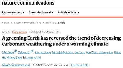 3月16日,公司曾思博、蒋勇军教授团队在自然期刊旗下子刊《自然通讯》(Nature Communications)发表了题为《全球绿化逆转了升温对碳酸盐风化造成的负面影响》(A greening Earth has reversed the trend of decreasing carbonate weathering under a warming climate)的研究论文。该研究发现过去几十年全球植被绿化促进了碳酸盐风化即岩溶作用产生的大气CO2捕获,同时证实了未来全球岩溶区的生态修复工程或可成为调控岩石风化碳汇的潜在抓手,这些发现具有重要的科学意义与应用价值。
