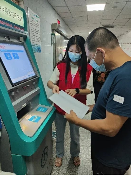 于月菡同学于2022年7月18日,前往山东省高密市人民医院申请成为志愿者。在医院里,她主要负责在门诊一楼东放射科签到机处协助患者签到、关注微信公众号、绑定手机号等。在她的帮助下,患者及家属能够运用医院新式签到机,减少了排队等待的时间,为患者及其家属提供了高质量的服务。