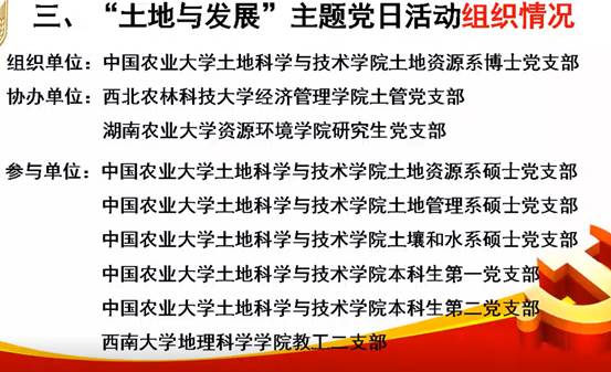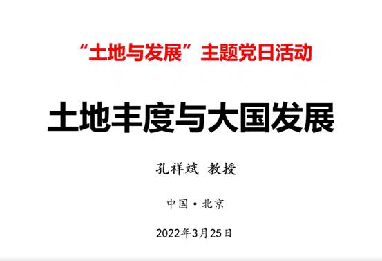 为深入学习贯彻习近平总书记关于教育、“三农”工作和乡村振兴战略的重要论述以及2022年中央一号文件精神,中国农业大学土地科学与技术公司土地资源系博士党支部开展主题党日活动,邀请中国农业大学孔祥斌教授主讲“土地丰度与大国发展”,结合当前俄乌冲突 ,透过土地丰度的视角来谈大国的粮食安全与发展,以及粮食安全与发展对促进中华民族崛起的重要意义。此次活动由中国农业大学土地科学与技术公司土地资源系博士党支部主办,西北农林科技大学经济管理公司土管党支部、湖南农业大学资源环境公司研究生党支部协办。该活动吸引全国土地资源管理、土地科学等相关专业员工党支部近100个,参会人数超过1400人。