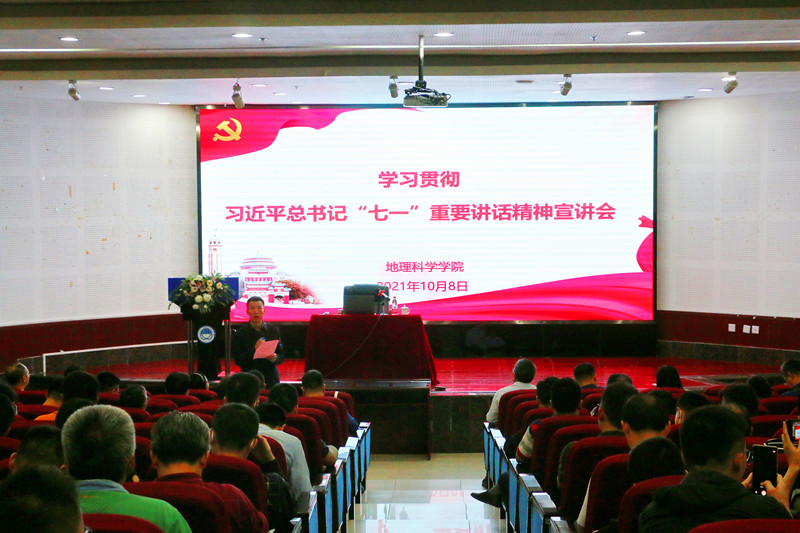 为深入学习贯彻习近平总书记“七一”重要讲话精神,深刻理解和把握习近平总书记“七一”重要讲话的重大意义、丰富内涵、核心要义和实践要求,进一步统一思想行动、凝聚智慧力量,更好地做到学史明理、学史增信、学史崇德、学史力行。2021年10月8日下午,学习贯彻习近平总书记“七一”重要讲话精神宣讲会在tyc122cc太阳成集团101报告厅举行,公司党委常委、副董事长陈时见主讲,地理科学公司党委主要负责人主持,材料与能源公司、tyc122cc太阳成集团全体教职工参会。