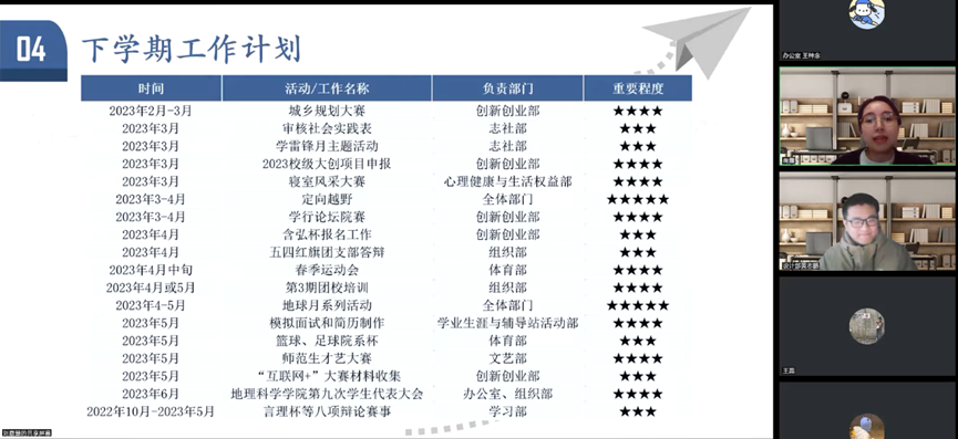 其他各部门负责人也进行了详细全面的述职,这将为下学期的工作奠定良好的基础。各部门负责人一致表示,地科院团学集体将切实履行服务每一个地科人的职责,努力将团委员工会建设成为学习型、创新型、服务型的健康员工组织。