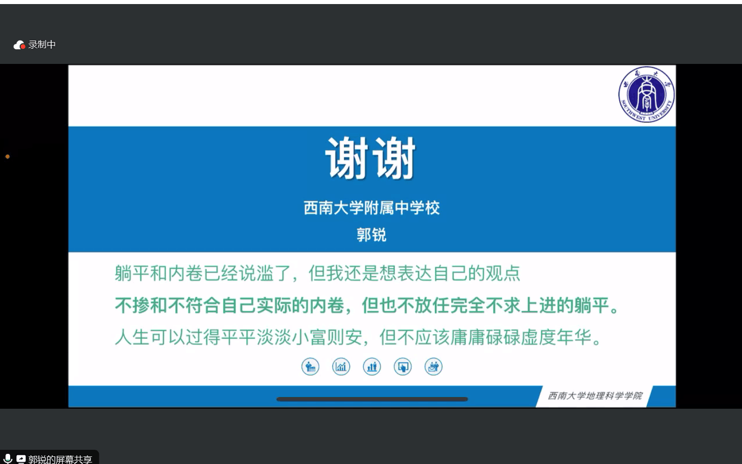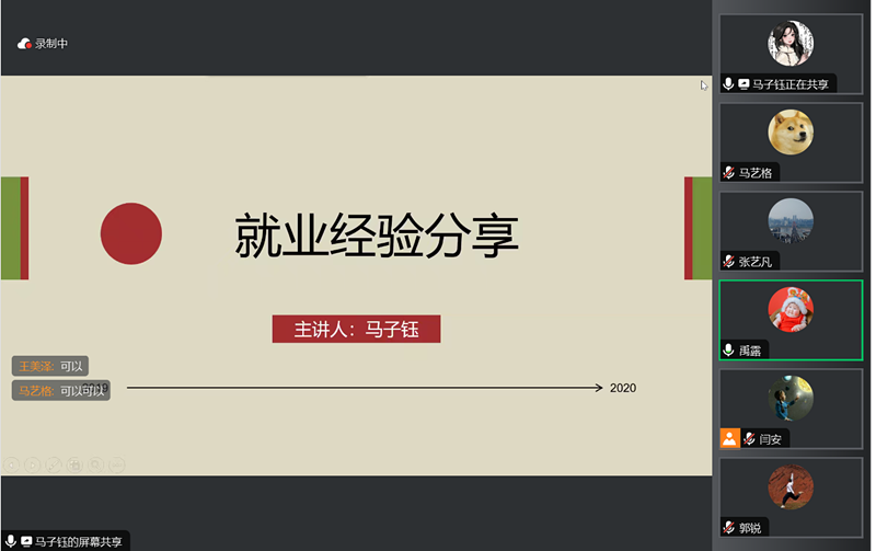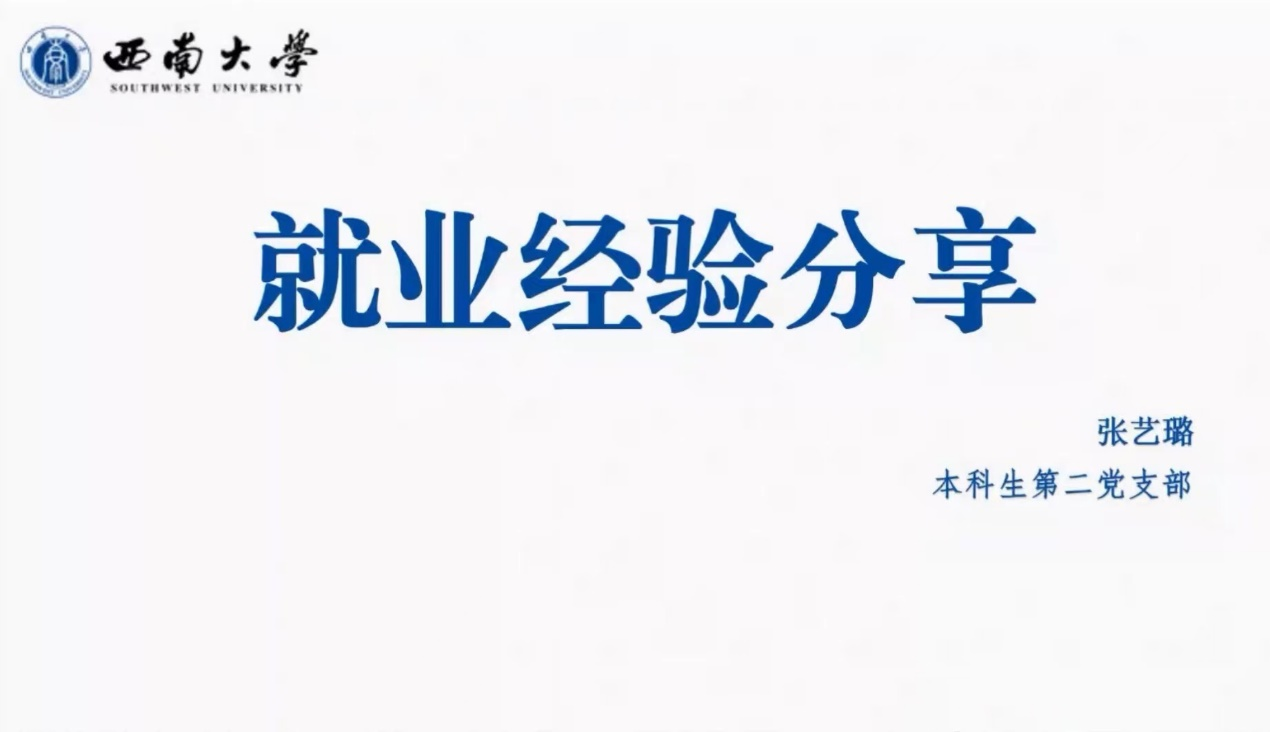 随后,来自2019级的四位优秀师范生党员为参会的低年级同学分享了求职经验。张艺璐从招聘信息获取、应聘流程一览、签约注意事项三个方面进行介绍,她谈到简历的投递要突出自身个性,不应在内容上贪多;郭锐着重提出要做好就业规划,强调就业选择前的信息检索能力,并且分享了他的个人说课经验;马子钰谈到要做好专业知识积累、片段课训练与高考题练习等一系列准备,强调就业要放平心态;岑雨濛则分享了她在重庆本地的求职经验,并详细分析了部分公司的招聘条件。